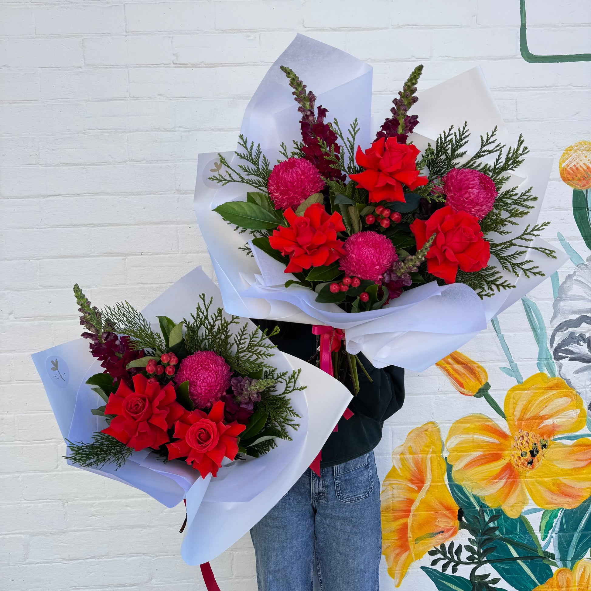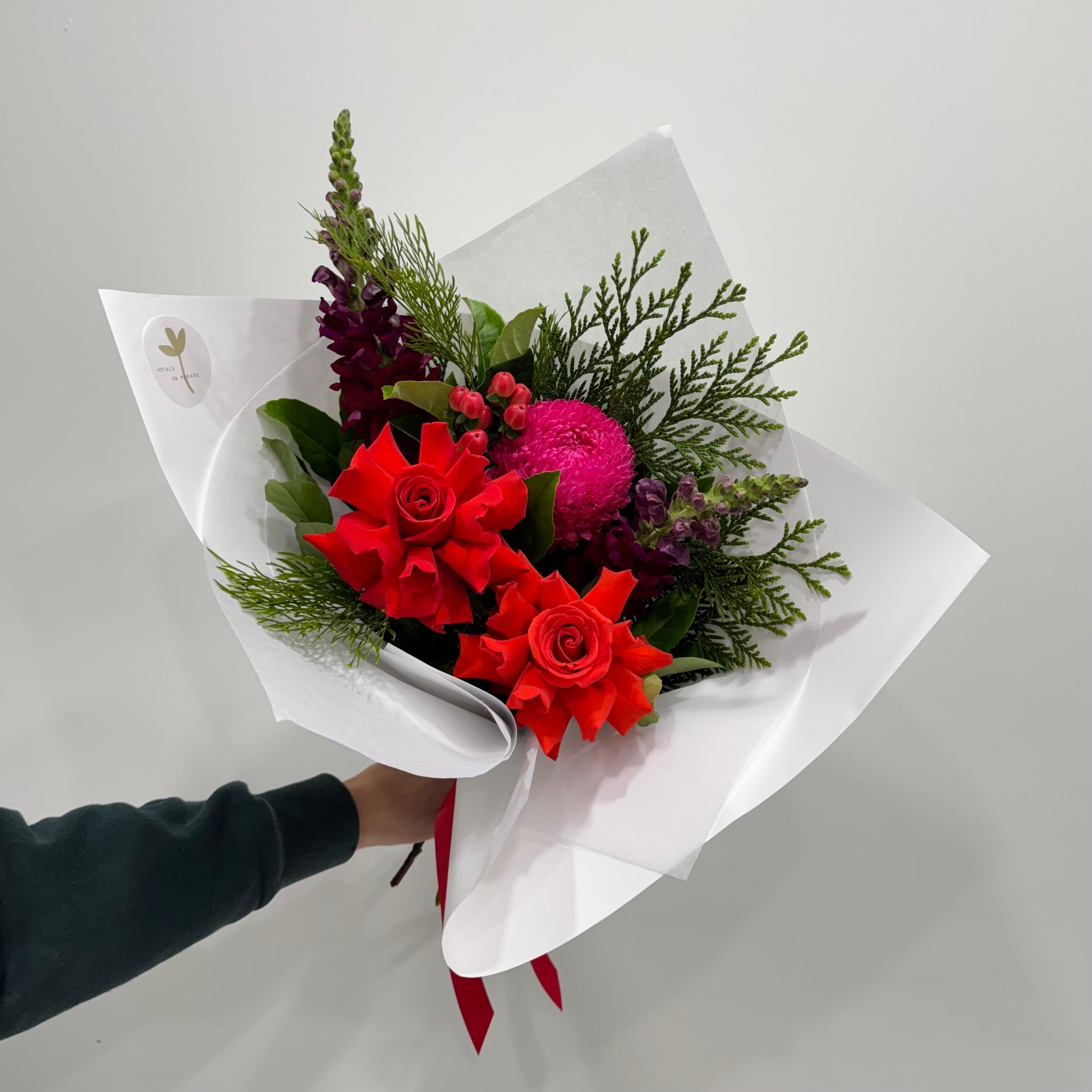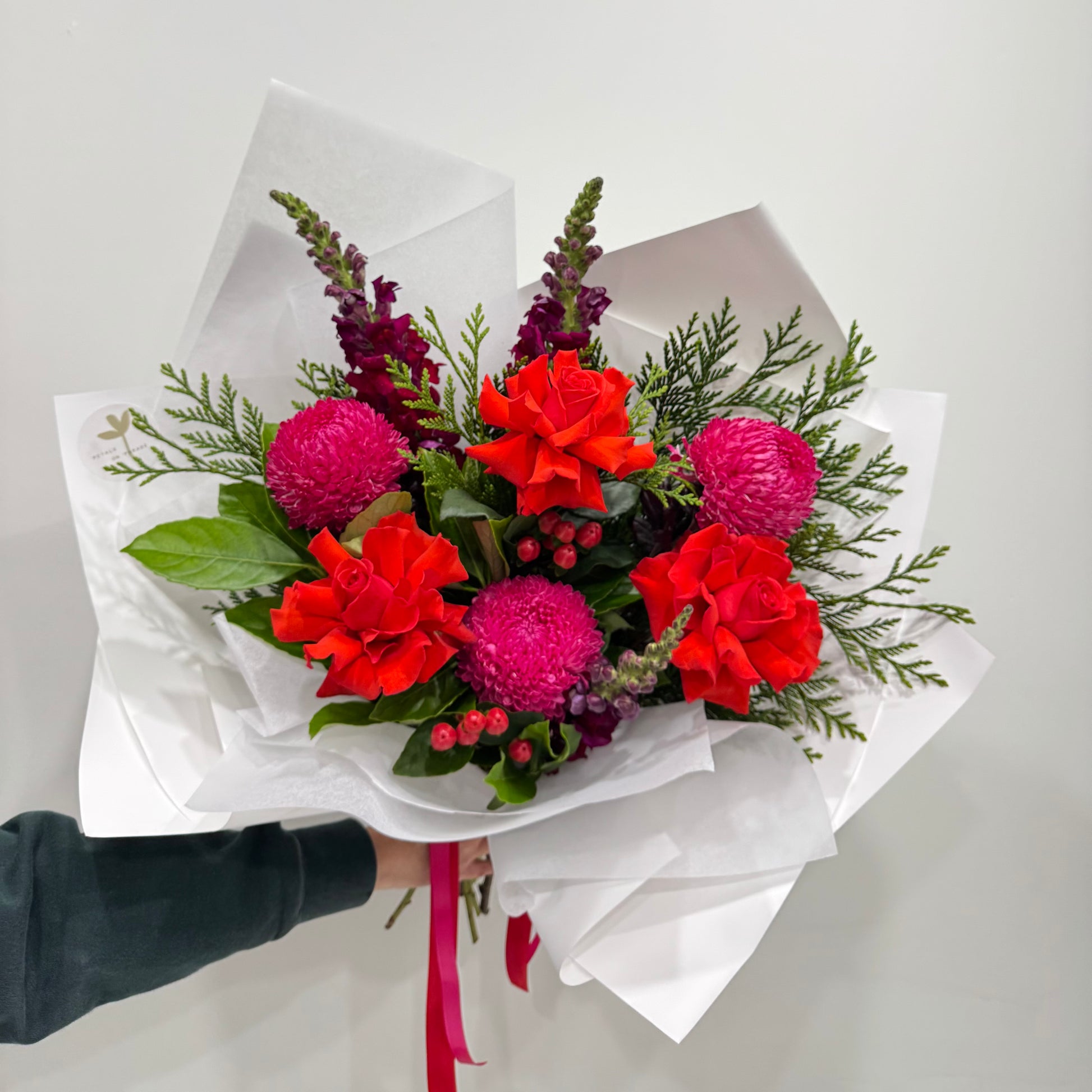 A swirl of pink and red flowers with holiday greenery. Cheerful, colorful, and full of Christmas spirit—perfect for gifting or brightening your own home.