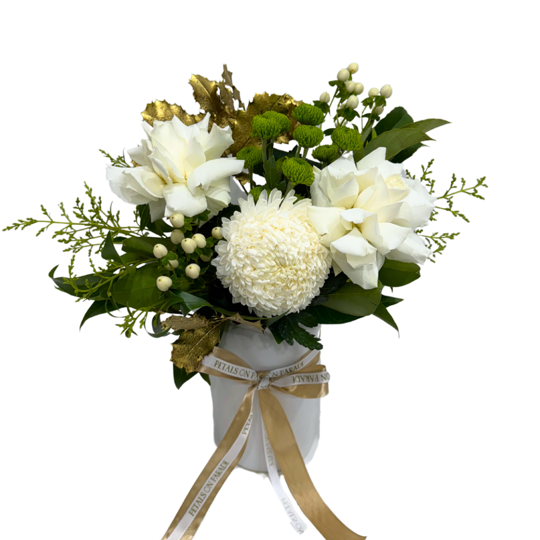 A very FESTIVE white ceramic vase filled with Christmas themed flowers.
