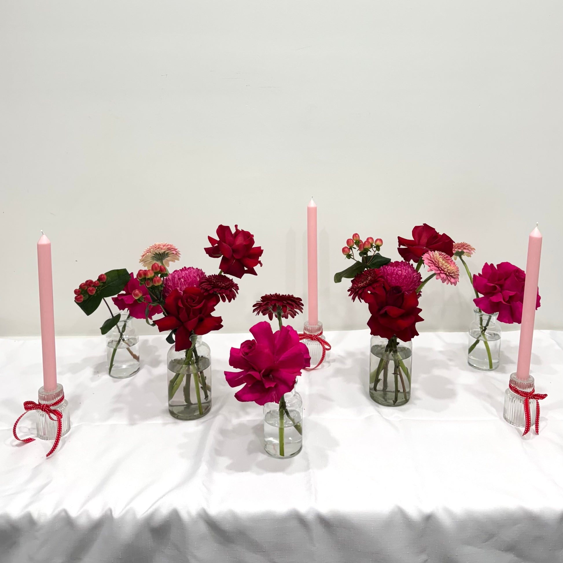 - Set of 3 Pink Dinner Candles + Matching Holders + Ribbon