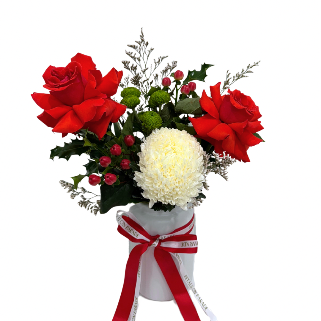 A very MERRY ceramic vase filled with Christmas themed flowers.